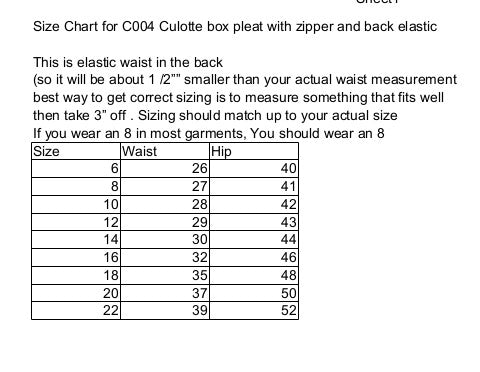 These inverted center box pleat culottes have the appearance of a skirt and the flexibility of pants. This style has front patch pockets, center kick box pleat in the FRONT and BACK, , back ELASTIC , front waist band, side zipper. 26" length